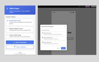 Stitch Export, geliştiriciler ve tasarımcılar için tasarlanmış bir Chrome eklentisidir. Stitch arayüzüne entegre olarak çalışan bu araç, kullanıcıların tüm konuşma geçmişlerini yapılandırılmış, LLM-uyumlu formatlarda dışa aktarmalarını sağlar. Kullanıcılar, verilerini Claude Code veya OpenAI ChatGPT ile paylaşmak veya arşivlemek için tek tıklama ile işlemlerini gerçekleştirebilirler.